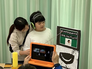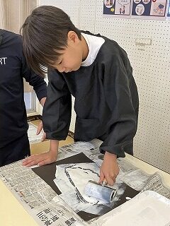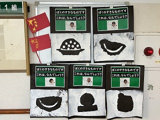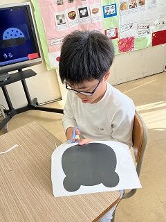 11月20日の「校長にっき」の通り、11月18日に中国の達敏学校とオンライン交流会を行いました。児童は、この交流会に向けて、クイズで使うグッズ作りを行いました。ハサミを使って紙を切ったり、台紙の上に切った紙を置いてローラーで絵具を付けたりするなど紙版画の技法で自分の好きな物のシルエットを制作しました。当日は、学習した成果を発揮しながら、達敏学校のお友達に「これはなんでしょう?」と自信をもってクイズを出すことができました!