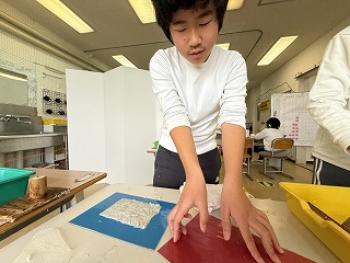 5・6年合同で「牛乳パックから再生紙を作る紙漉きの作業」に取り組んでいます。