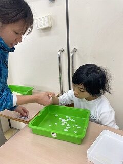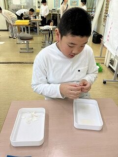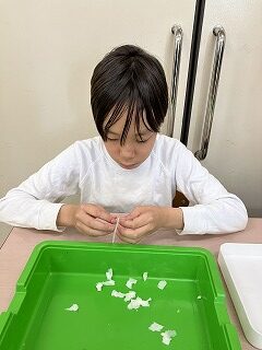 ①牛乳パックのラミネートを剥がす作業班、②柔らかくなった牛乳パックを手で細かく千切る班、③計量機を使って決められた5g、10gと決められた重さに測定する班、④計量された紙をさらにミキサーで攪拌して紙漉き作業を行う班と、5,6年縦割りのグループメンバーがそれぞれ4つの工程に別れ、分担作業に取り組んでいます。
