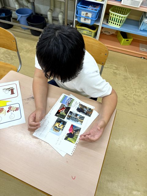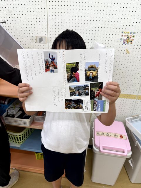 今日、木工室で作業をしていると、小4児童のAさんが「校長先生いますか?」と訪ねてきてくれました。「いますよ。何か用ですか?」と尋ねたのですが、返事はありません。木工室は教員が作業を行う部屋ですので、Aさんにとっては初めての場所、見たことのない工具類にも興味深々。そこで、場所を変えて話を聞くことにしました。Aさんの手には、担任の先生と自立活動/国語の個別指導で作った紙が握られています。どうやら、9月にご家族と出かけたサファリパークの写真を貼って、その時の様子を説明する学習をしたようです。