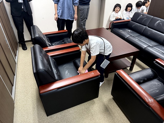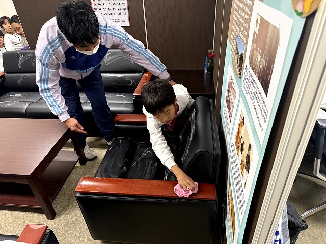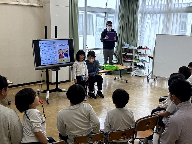 こちらは1・2年生の授業です。お仕事遊びは先週で終わり、今回からはお手伝いをテーマにした授業に変わっていました。いくつかのグループに分かれて、困っている人を助けていきます。グループの一つは、校長室のおそうじをしに来てくれました。それぞれの場所では、助けてくれたお礼にコインをもらえます。教室に戻った後、活動の振り返るを終えると、お楽しみ時間。もらったコインをお菓子に交換して食べることが出来るのです。子供たちにとって、とても分かりやすい流れが作られていました。