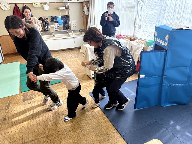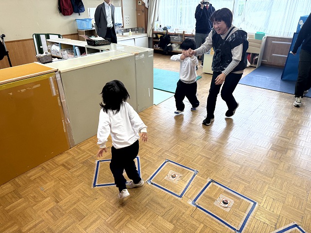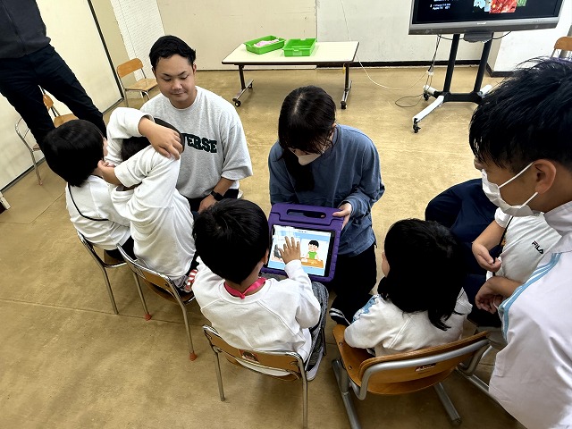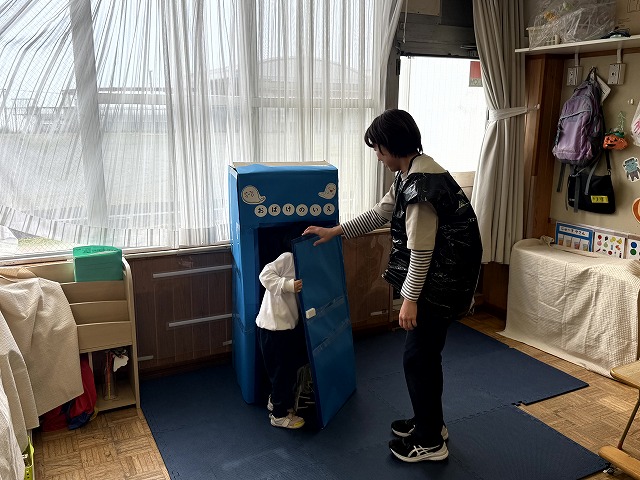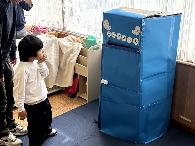 りす組、この日の遊びは「おばけのかくれんぼ」。ハロウィーンまでの遊びで使い、楽しい経験をした段ボール隠れ家を使った遊びです。子供たち同士の関りが自然と生まれ、やり取りが楽しくなってくる仕掛けでした。また、かくれんぼの待ち時間にもちょっとした工夫がありました。待ち時間のタイマー代わりの小道具、これが違う絵柄で回数分準備されていました。さらに、ここでの遊びの写真を使って、個別の学習でやり取りの学習を進める形になっていました。とても考えられた授業だと感じました。