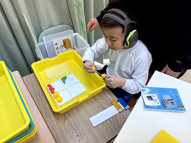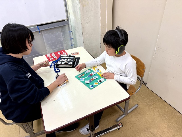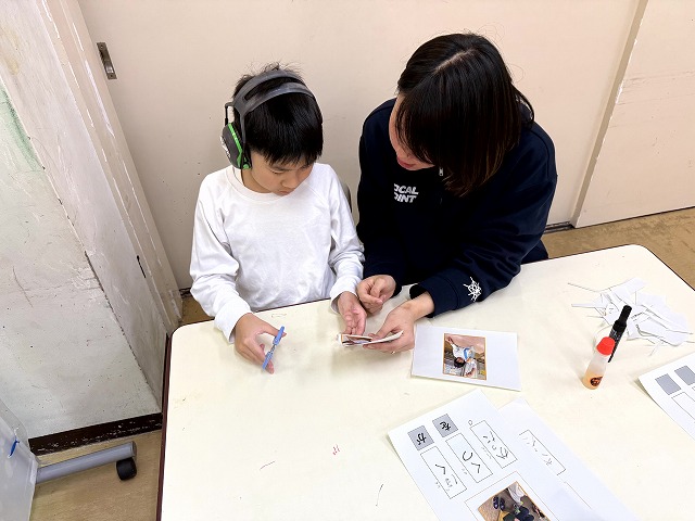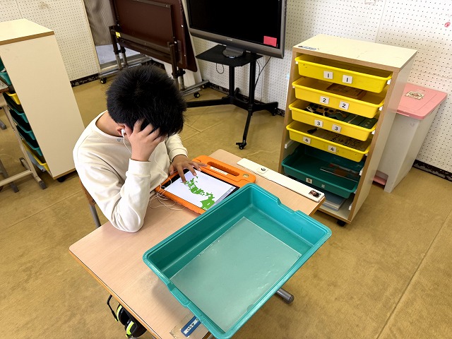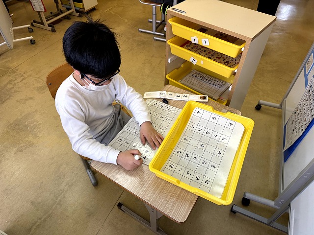 本校には、国語・算数/自立活動という授業があります。学級には発達段階の異なる児童が在籍するため、国語と算数は自立活動の指導と併せて、個別に行う時間があるのです。個別に指導を行う間、他の児童は自分にあった課題を自分一人で進めます。この課題を「自立課題」と言います。自立課題は国語や算数の課題を一人で進めることで、自分一人でできるという自信や自立性を育みます。もちろん、学習の習熟度もあがりますし、少し難しい課題に対しては、助けを求めるコミュニケーションの場にもなるのです。