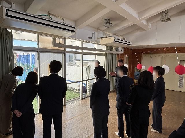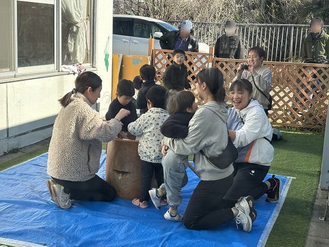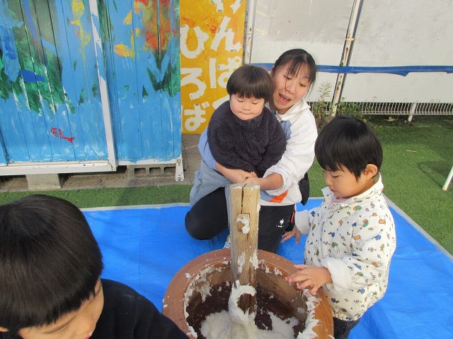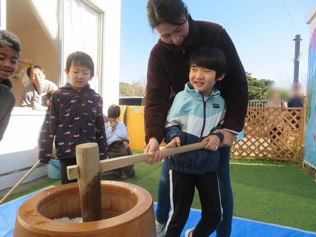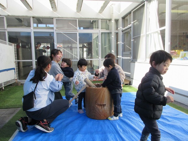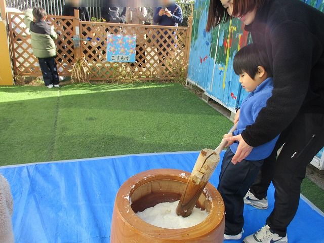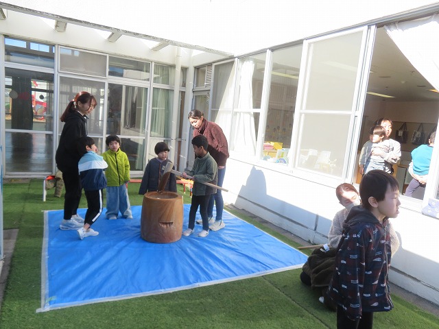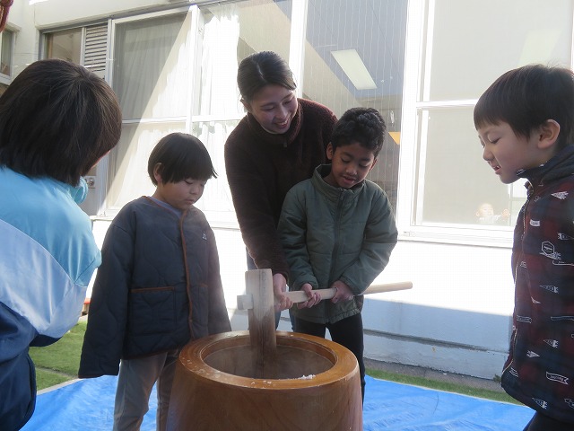 幼稚部をご案内している際には、幼稚部で餅つきを行っていました。この日は保護者の参観も可能となっていたため、学級ごとに交代しながら、多くの保護者が参観されていました。