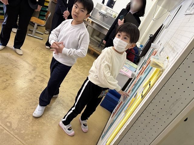 法務省の視察の話に戻ります。幼稚部の教室見学を終えた後、小学部の教室へ移動しました。1年生の教室では、ちょうど休み時間であったことから、子供たちがスケジュールの使い方を視察の皆様に説明してくれました。その後、自立課題の説明を行い、高学年の授業の様子もご覧いただきました。