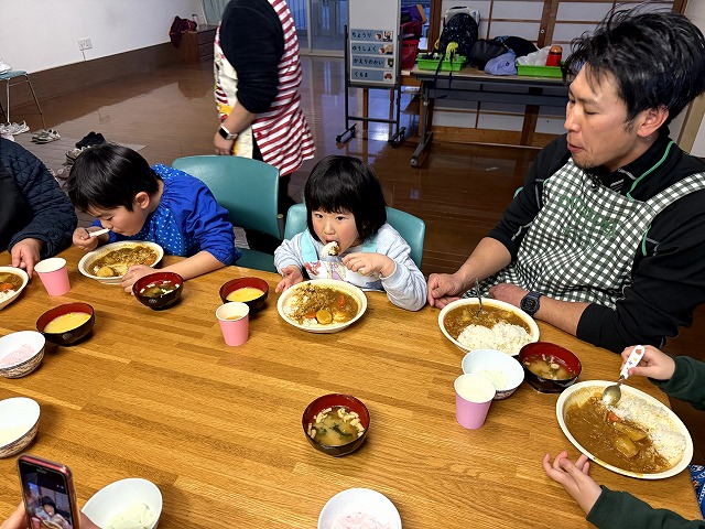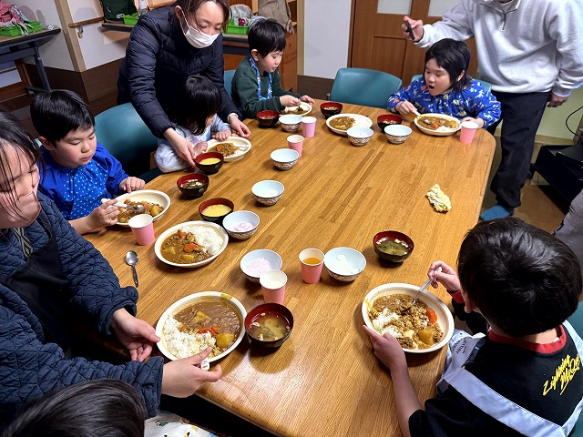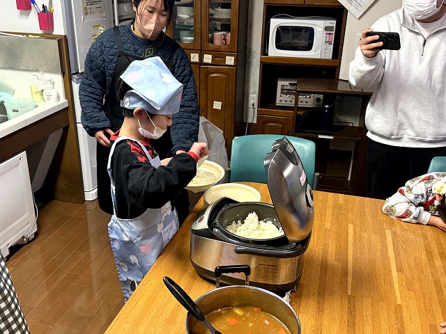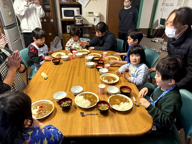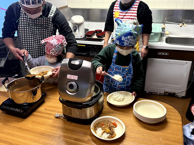 様子を見に行くと、夕食のカレーづくりの真っ最中でした。カレーの仕込みが終わると、スープを選んだり、デザートづくりに取り組んだりと、それぞれの役割を楽しんでいました。最後にルーを入れてかき混ぜ、いよいよ完成です。