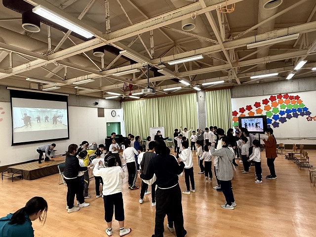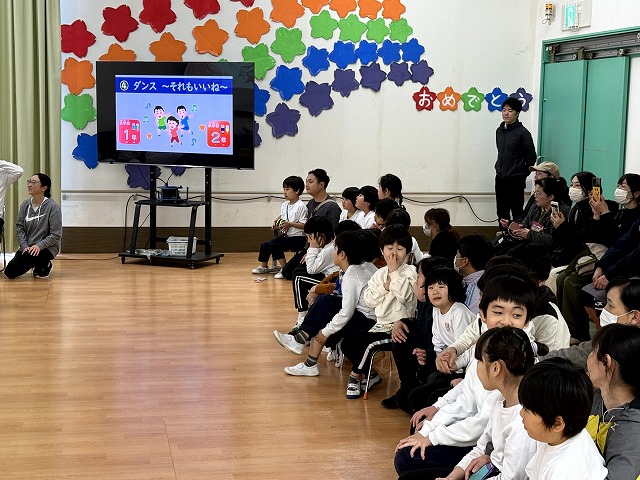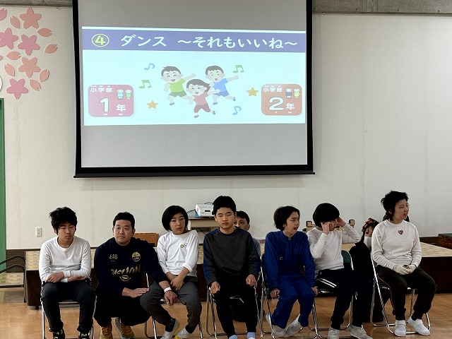 卒業生紹介の後には、1・2年生主導によるダンスが行われました。映像を見ながら、小学部児童全員が一緒に踊り、会場が一体となるひとときとなりました。