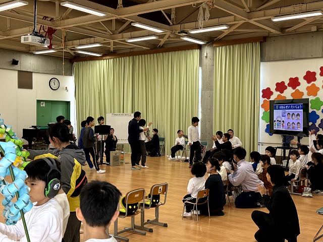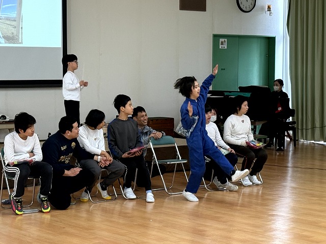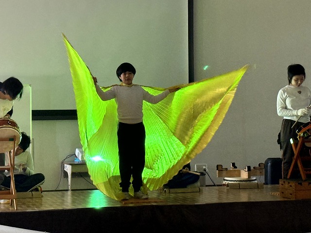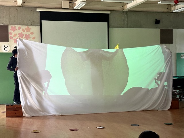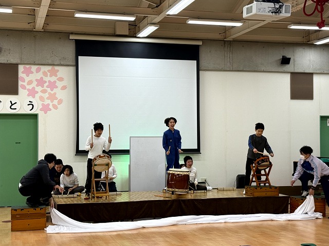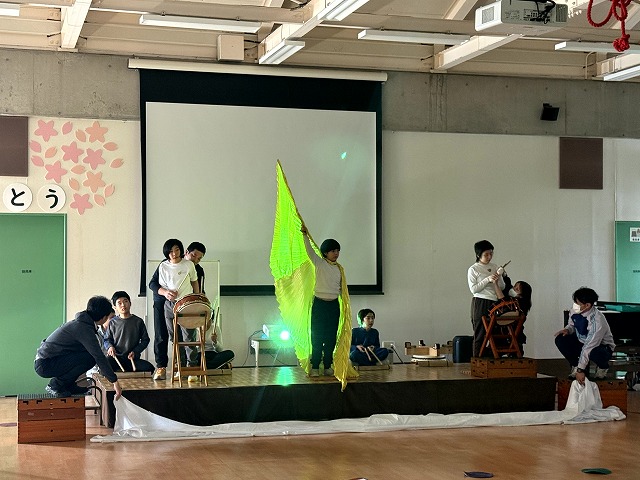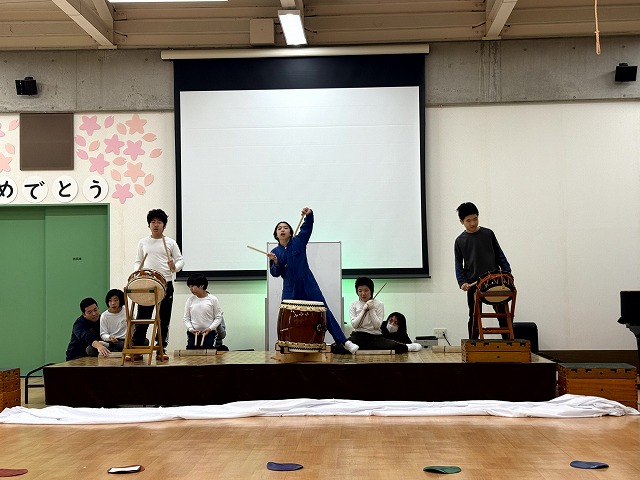 ダンスが終わると、いよいよ卒業生の発表です。今年の発表は和太鼓パフォーマンスでした。発表は2部構成で、白く大きな布を緞帳代わりにして場面転換を行います。プロジェクターを使った映像効果や、前列と後列が入れ替わっての迫力ある太鼓演奏など、子どもたちは素晴らしいパフォーマンスを披露してくれました。