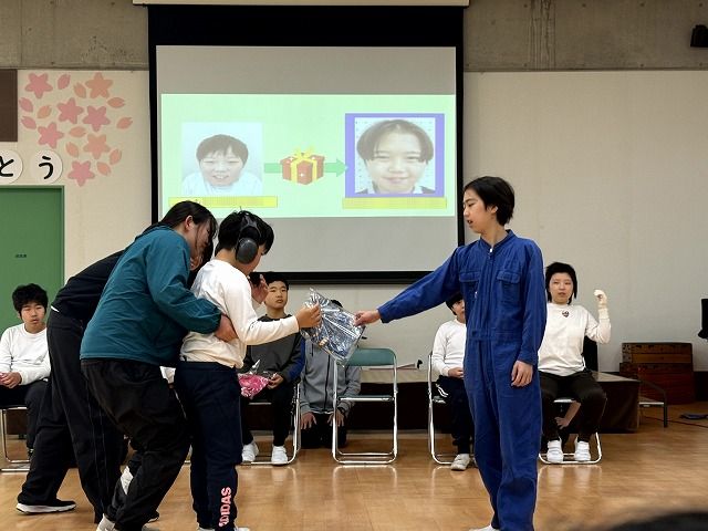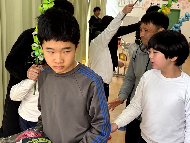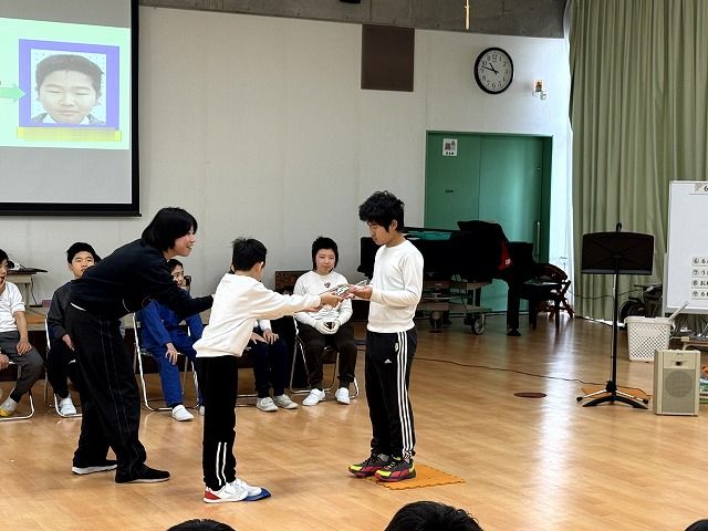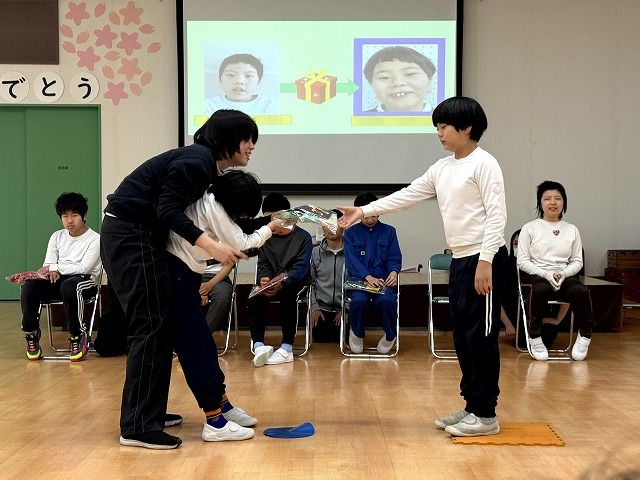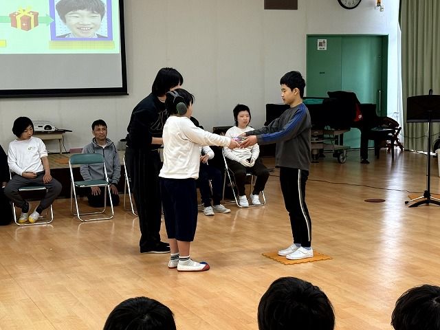 6年生の発表が終わると、4年生からのプレゼント渡しが行われました。一人ひとりが心を込めて作った手作りのプレゼントを、卒業生に手渡していきます。
