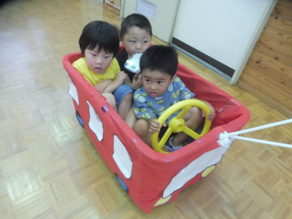 5月の遠足に合わせてラッピングしたバスの遊具や、そりのような台車が出てくると、「のせてー」と駆け寄ってきたり、ドアの前で「乗り物を出して」と教師に伝えたりしていました。乗り物に友達と一緒に乗ったり、友達を乗せて引いたり押したりしました。また、ハンドルのおもちゃを持ち、教師に乗り物を引いてもらって運転手さん気分で遊ぶ子もいました。